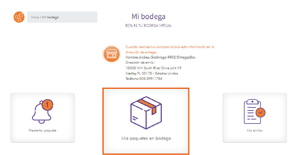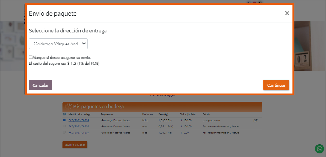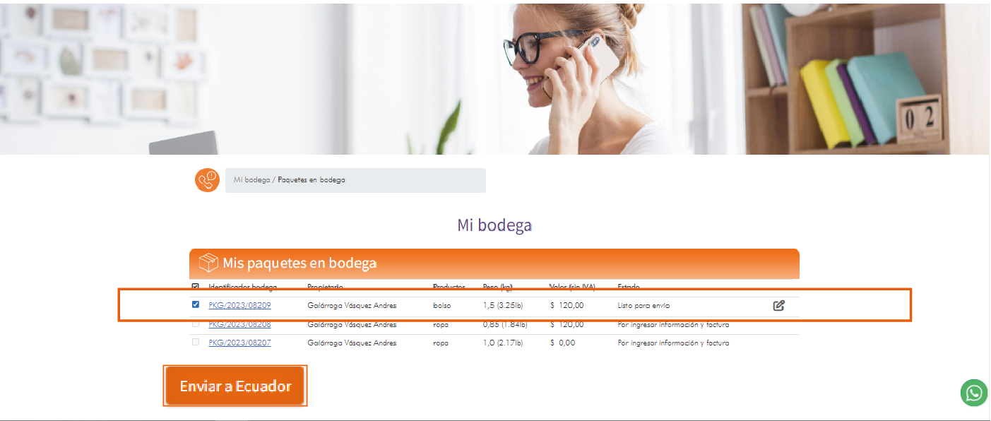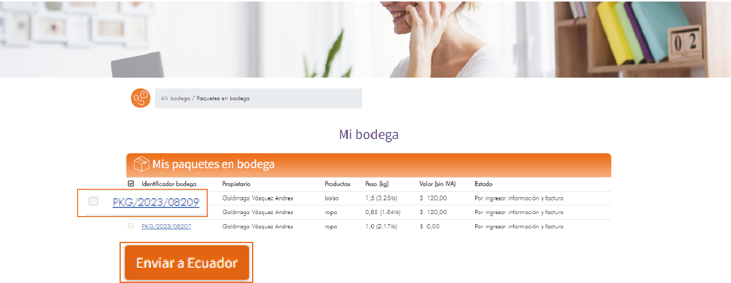 3) Selecciona tu paquete que deseas enviar a Ecuador, haciendo clic en el “Identificador de la Bodega” y luego “Enviar a Ecuador”