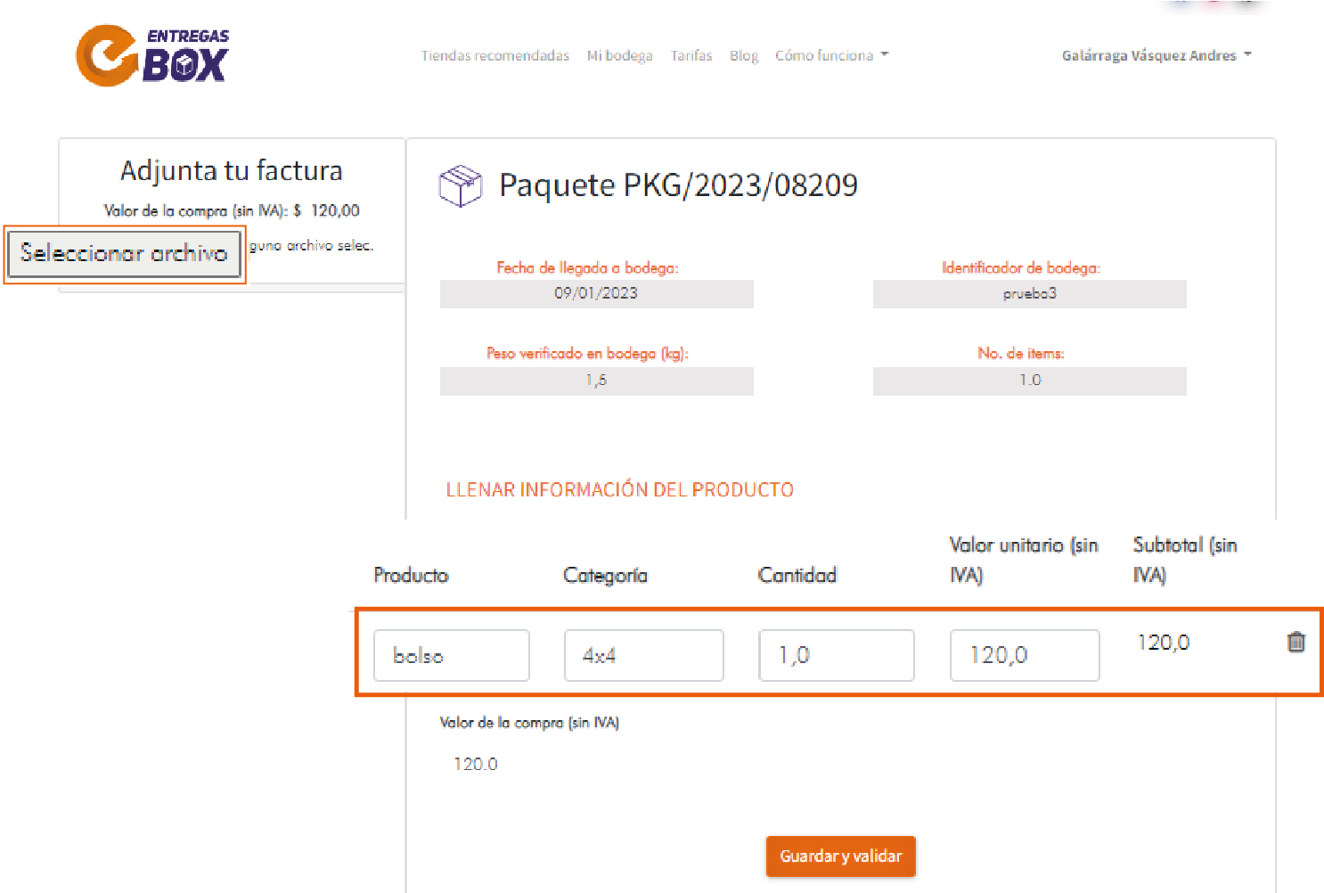 4) Una vez seleccionado tu paquete, tienes que adjuntar tu factura emitida por el establecimiento donde realizarte la compra de tu producto y completar los campos de cantidad y valores unitarios sin IVA. Luego guardar y validar.