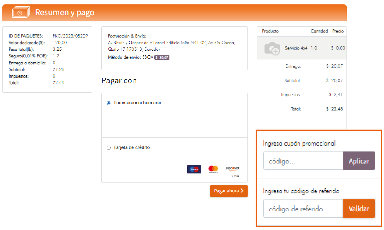 7. En la ventana de Resumen y pago se muestra detalladamente la información de envío y nuestro paquete, una vez que validemos estos datos, procederemos a seleccionar nuestro método de pago. En caso de tener un cupón promocional o un código de referido debemos colocarlo en esta pantalla para recibir el beneficio.